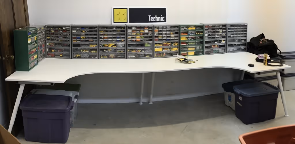 I have bookshelves for some of my My Own Creations (MOCs), and other MOCs are stored in plastic tubs. For the parts I use to build new MOCs, I have parts sorted by part number, and then if I have too many of a part number, I sort by color.