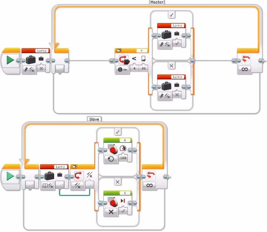To implement a basic Host/Client design pattern in EV3 we need at least two loops – the host or main program loop and the client lamp loop – and a variable controlled by the main program in the host loop that tells the client loop when to fire an action or a condition, in our case, when the lamp loop will turn the lamp on or off.