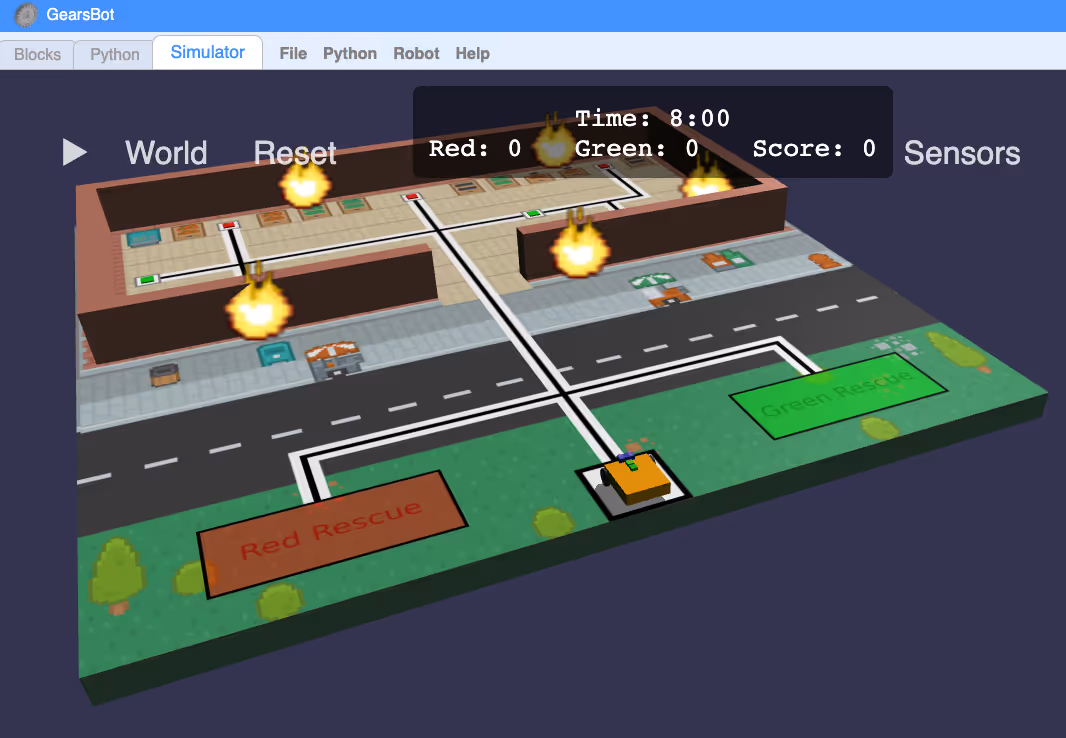 From the creator of EV3DevSim, Gears is a newer and more capable simulator that supports Blockly and Python. Generated Python code can run on a physical EV3 robot running ev3dev or Pybricks.